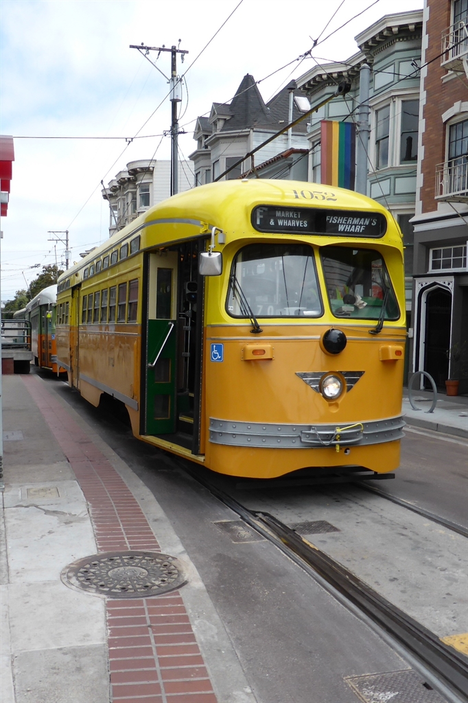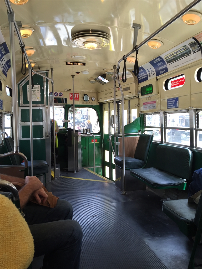 With our “ticket-to-ride” and Muni Map, we set off for the heritage streetcars that would take us down to Pier 39 and Fisherman’s Wharf. These are separate from the Cable Cars and the more modern MUNI system electric trams, and they run along Market Street and Embarcadero. The heritage streetcars are a collection of fully restored vintage streetcars, trolleys and trams from San Francisco and many other world cities. We rode on No.1052.