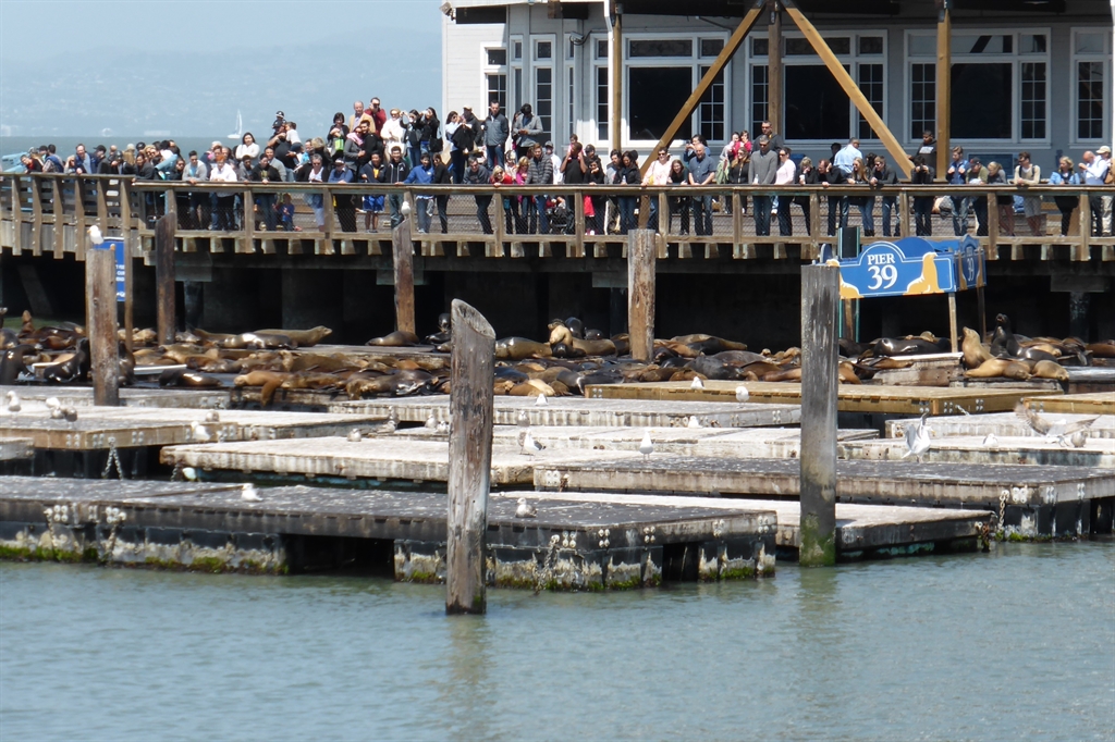 Hopping off the tram we had a short walk to Pier 39, which is a waterfront attraction that is built on a pier. There are shops and restaurants, live music, and other attractions for visitors to the pier. Including sea lions. A lot of sea lions! In fact there are hundreds of sea lions that bask in the sun on rafts around Pier 39 in amorphous piles.