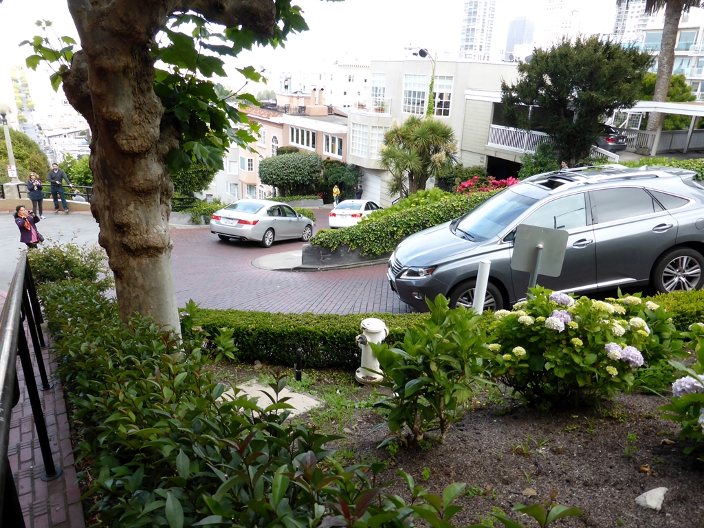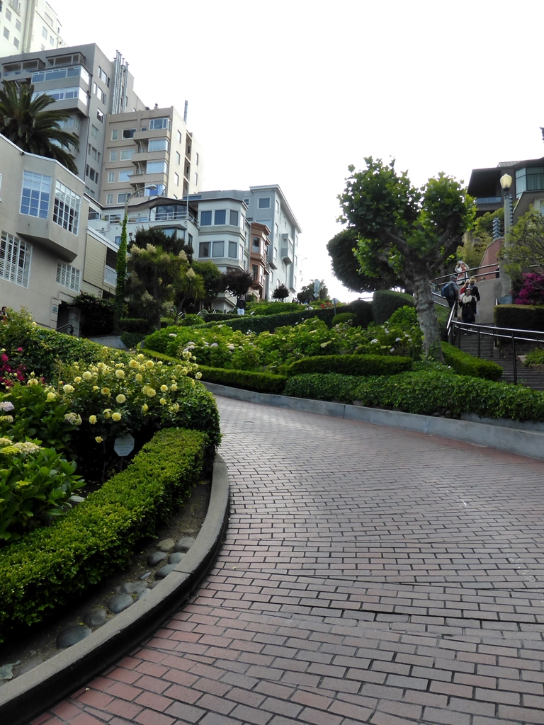 Continuing on our walk we found ourselves at Fisherman’s Wharf and passed by a little marina. Then walked around to Ghirardelli Square where we had some lunch. Walking back to Hyde Street, we decided to walk UP the very steep hill and see the famous winding section of Lombard Street. (What were we thinking? Actually – I was thinking that people in San Francisco must be really fit with having to walk all those hills all the time! ) There was an endless stream of people driving down Lombard Street in cars and walking up and down on the footpath. I think the residents would be pretty tired of tourists! We joined the throng of people and walked down the street. It is so amazingly steep!