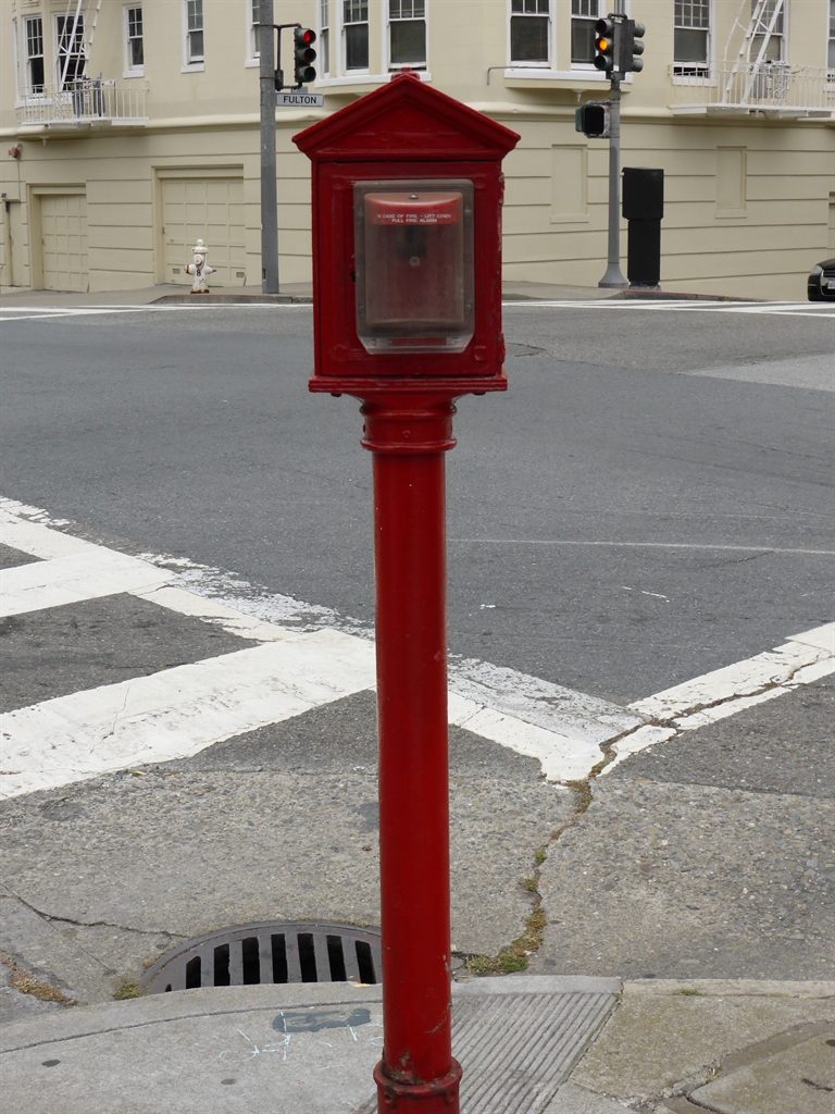 In a neighbourhood of Victorian style wooden houses, this old fire box alarm we found on the street corner is an appropriate reminder of times past. When someone pulls the alarm a telegraph wheel taps out a message to the nearest fire station, announcing the box number. The box looks antique, but it still serves its original purpose.